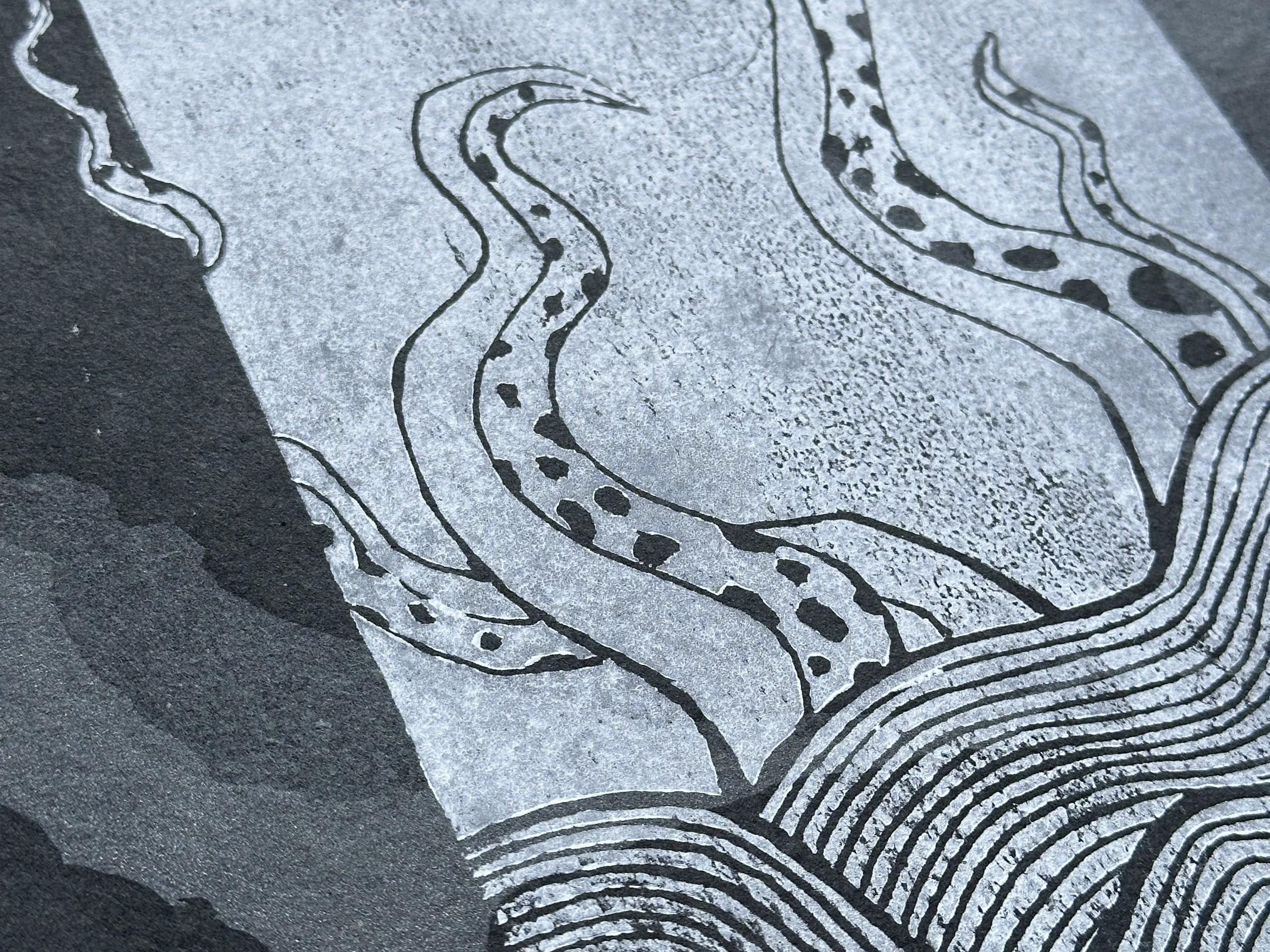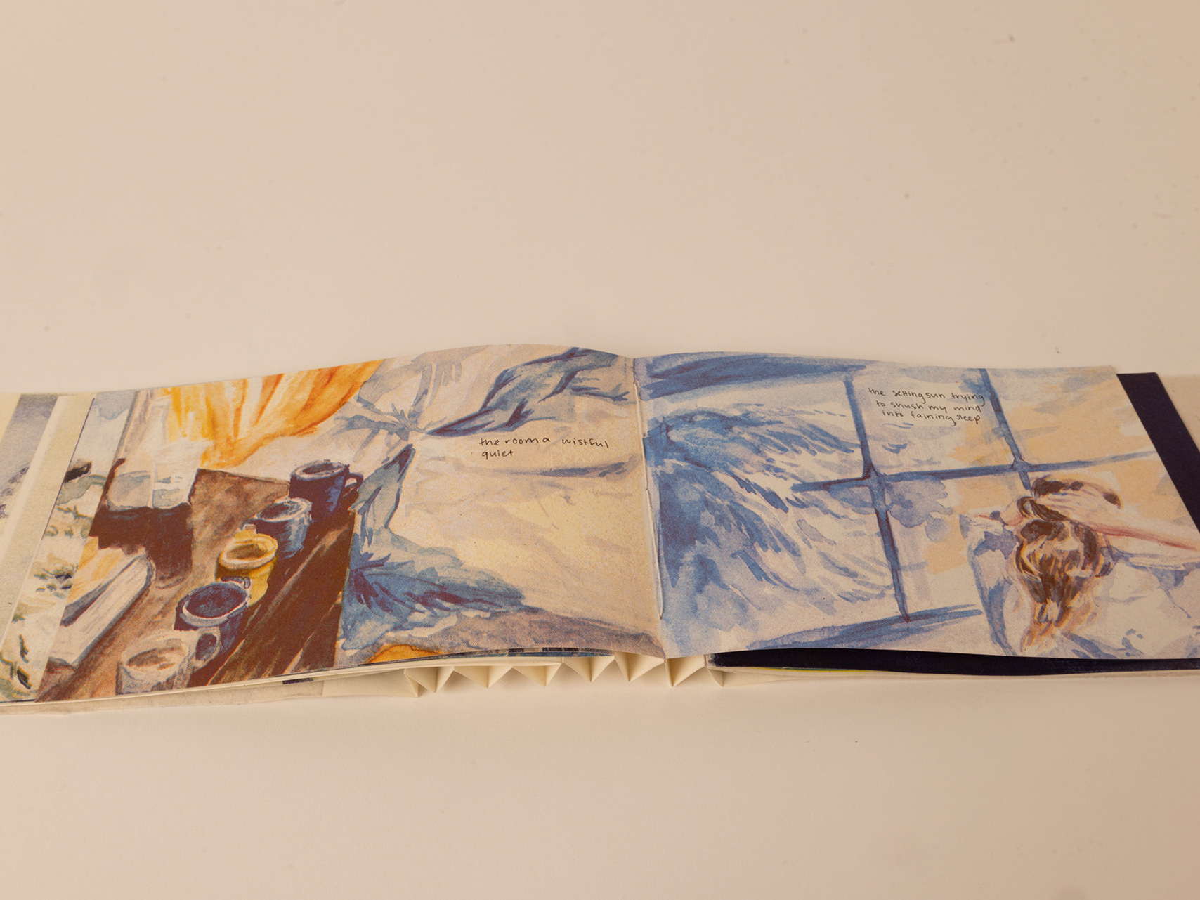 This folded book is a portrayal of trees and the life that they hold. People often look at plants as simply objects or decorations. Seeing their only value is for their beauty or utility. Page by page you can see the inside of a tree and its flow of life with its peaceful nature and edging rings of wood. Anthropomorphizing this tree allows more emotional connection to see beyond its hard exterior and the life inside.